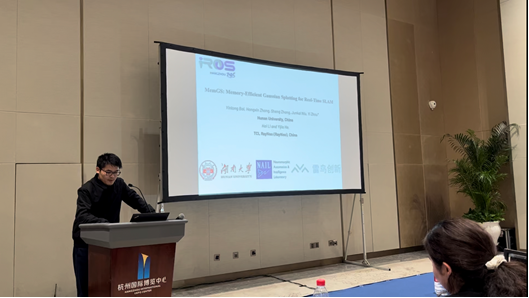 同日,我院博士生白银龙同学进行题目为为”“MemGS: Memory-Efficient Gaussian Splatting for Real-Time SLAM”的报告。该研究为处理3DGS-SLAM中冗余的三维高斯基元,提出了一种基于几何相似性的体素空间合并方法,该方法在不影响系统运行性能的前提下有效减少了GPU内存占用。在系统前端,采用ORB-SLAM3作为视觉里程计,用于获取初始位姿和稀疏地图点。在系统后端,在同一体素内融合几何相似的3D高斯基元,最后构建联合损失函数以实现对整个场景的建模。基于公开数据集的定量与定性评估表明,本文方法在内存效率与渲染质量方面均取得了良好效果。