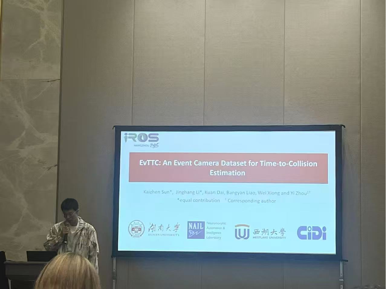 10月21日,我院硕士生孙凯振同学在IROS会场上进行题目为“EEvTTC: An Event Camera Dataset for Time-to-Collision Estimation”的报告。该研究构建了一个面向碰撞时间估计任务的事件相机数据集EvTTC,包含多类目标场景下的丰富数据序列,涵盖真实车辆、充气车辆及假人等多种目标,并覆盖常规与极端情况下的多种相对运动速度。研究同时提出一种低成本、小尺寸的碰撞时间测试平台,能够生成不同相对速度下的准真实数据,该平台设计已全面开源。此外,工作还构建了针对碰撞时间估计任务的专用评测基准,为领域内研究者提供了统一、开放的算法评估与比较平台。