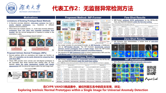 研究内容:探索仅使用正常样本进行建模,或完全不依赖目标领域样本(零样本)即可识别未知视觉模式的方法。代表性成果包括在首届CVPR VAND挑战赛中获得亚军的零样本工业缺陷检测算法Segment Any Anomaly(SAA),以及被VAND3多只获奖队伍采纳的基于内在正常原型重构的INP-Former方法。
